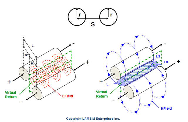 The right half of Figure 1 shows the magnetic-field loops and direction of rotation around each rod. Only one loop is shown for clarity, but the number of loops is a function of the amount of current and the length of the rods. The counter-rotating loops of current forms a virtual return at exactly one half of the space between the two rods. We call this a virtual return because if we were to put a conducting plane in the same position, the electromagnetic fields would look exactly the same.