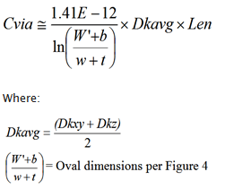 Referring to Figure 4, we then calculate the odd-mode capacitance for Cvia derived from an approximate formula for an elliptic coaxial structure developed by M.A.R. Gunston in his book, “Microwave Transmission Line Impedance Data” . In the original formula, both shield (W’+b) and inner conductor (w+t) are elliptical in shape and are dimensioned as shown. When the anti-pads are circular, then ln[(W’+b) /(w+t)] reduces to just ln[b/t)]; which is the denominator in the Coax equation. If we use Gunston’s approximation to calculate Cvia, then the equation becomes:
