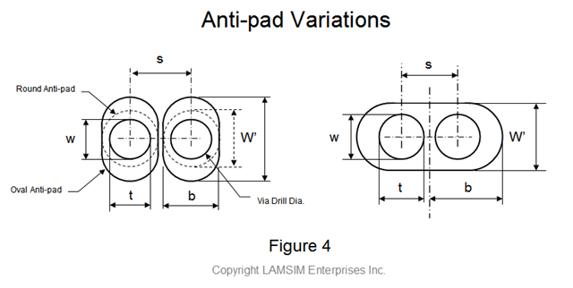 Anti-pads can vary in size and shape. They can be anything from round, to oval around each via, or even a large oval surrounding both vias as illustrated in Figure 4. Square, or rectangular variations (not shown) are similar. ![]()