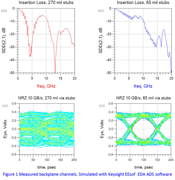 Figure 1 shows simulation results of two backplane channels. On the left are measured SDD21 insertion loss and eye diagram of a 10 GB/s, non-return-to-zero (NRZ) signal, with short through vias and long stubs ~ 270 mils. On the right, shows measured SDD21 IL and eye diagram of a channel with long through vias and shorter stubs ~ 65 mils