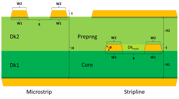 The most common PCB trace geometries are micro-strip and stripline. A simple microstriip geometry is bare copper traces over a reference plane, separated by a dielectric height H, as shown in Figure 1. Depending on the stackup, there may be a core and prepreg layer between the outer layer and reference plane with the same or different Dk values for Dk1 and Dk2.