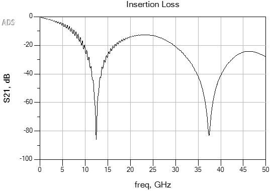 Figure 1 S21 Insertion loss plot showing resonant nulls due to quarter-wave stub resonances.