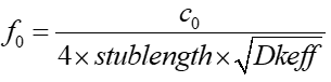 Given the speed of light (c₀), the length of the stub, and the effective dielectric constant (Dkeff) surrounding the via hole structure, the resonant frequency is predicted using: