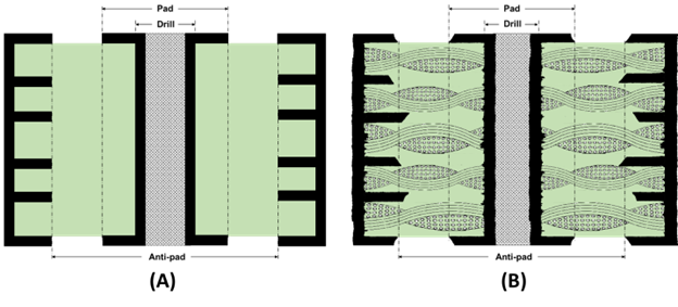 However, in reality, an as-fabricated x-section reveals deviations from ideal conditions, as shown in Figure 2 (B). Manufacturing tolerances result in misalignment of antipads across layers, and via barrels often exhibit rough surfaces with protruding whiskers which will affect dielectric properties. Moreover, since vias pass through a mixture of resin and fiberglass cloth, using bulk Dk values may not accurately represent material anisotropy. The true dielectric constant surrounding the via depends on the glass resin volume ratios of the pressed dielectric thickness and actual drill size used.