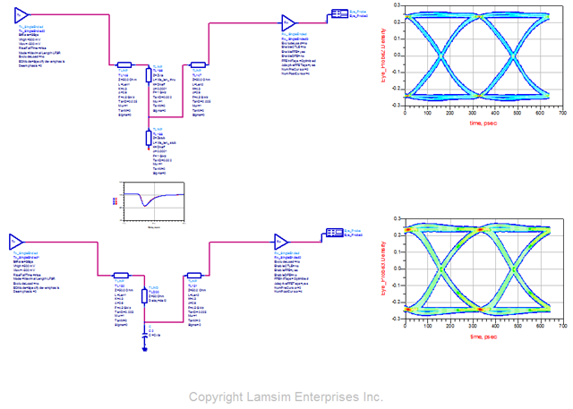 Figure 2 Eye comparison at 3.125Gb/s. Top topology uses 33 Ohm transmission lines for both the through and stub portion of the via. The bottom topology models the via with a 50 Ohm transmission line to represent the delay of the through portion and a 1.9pf capacitor to represent the excess capacitance. Modeled and simulated with Agilent ADS.