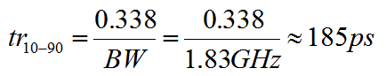 Equation 1 is a commonly used to convert 3dB bandwidth to equivalent 10-90 rise time. Substituting 1.83 GHz for the 3dB bandwidth, the rise time equals approximately 185 ps.