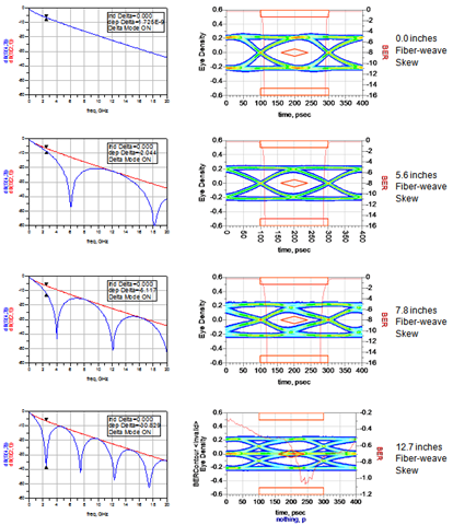 This figure presents the results from an ADS simulation I did recently of a PCIe Gen2 channel running at 5GT/s. The eye diagrams are at the receiver after approximately 30” of track length chip to chip. The channel model was parameterized to allow for adjusting the fiber weave effect length as required.