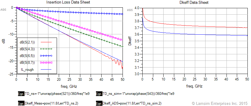 Figure 5. Comparisons of simulated Dkeff over frequency vs. measured. The red plot is actual measured Dkeff from the DUT. The middle pink plot is a simulation using Dkeff corrected due to roughness. The bottom blue plot is simulated using Dk at 12 GHz as published in Dk/Df tables and non-causal roughness model. The green dashed plot is a simulation using Dkeff due to roughness; a causal Huray-Bracken roughness model was used. Modeled with Simbeor [11] and simulated with Keysight ADS [12].