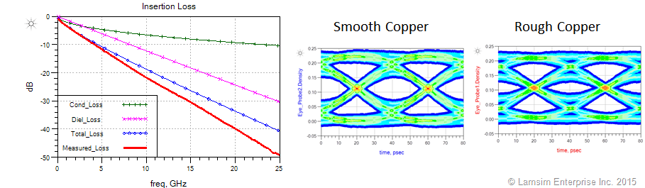 For dielectric parameters, we choose dielectric constant (Dk) / dissipation factor (Df) at or near the Nyquist frequency of the baud rate, then apply effective Dk (Dkeff) correction factor due to roughness, Equation 1 [5].
